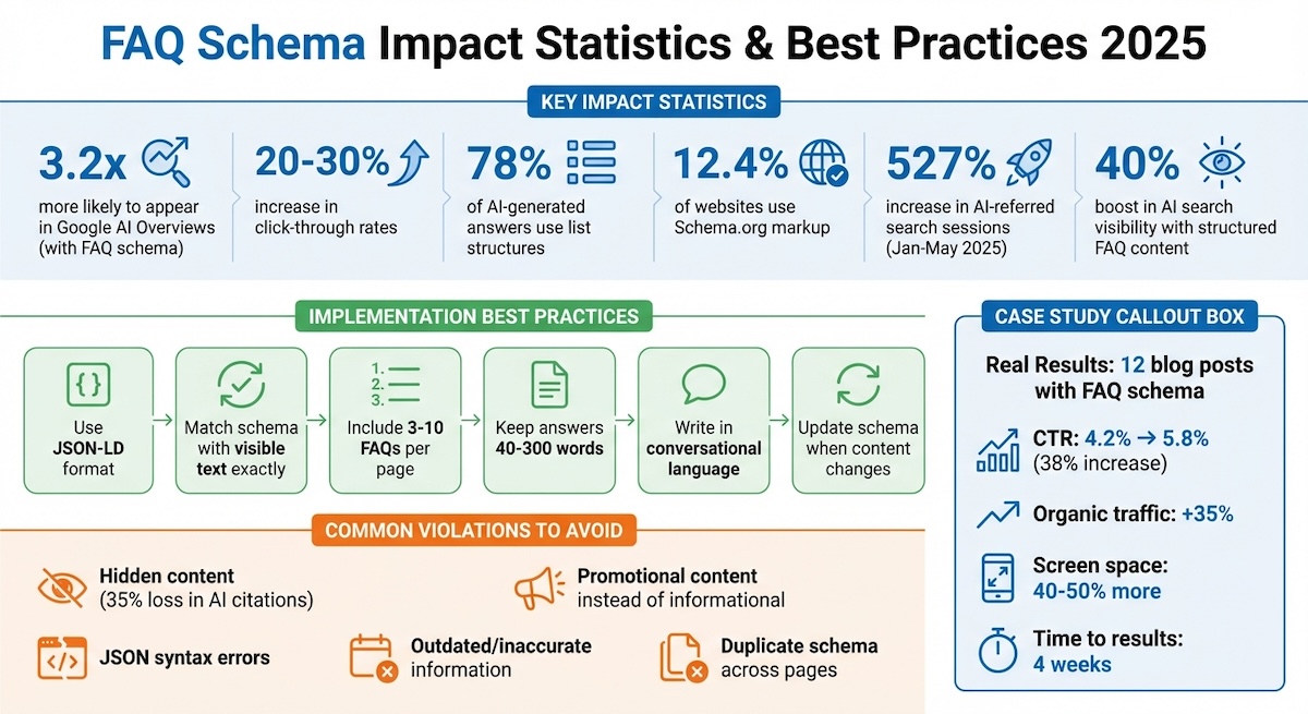 Good formatting plays a crucial role in getting your content featured in AI-generated responses. Adding FAQ schema can boost your chances of appearing in AI Overviews by approximately 40% for pages that already rank in the top 10 [6].