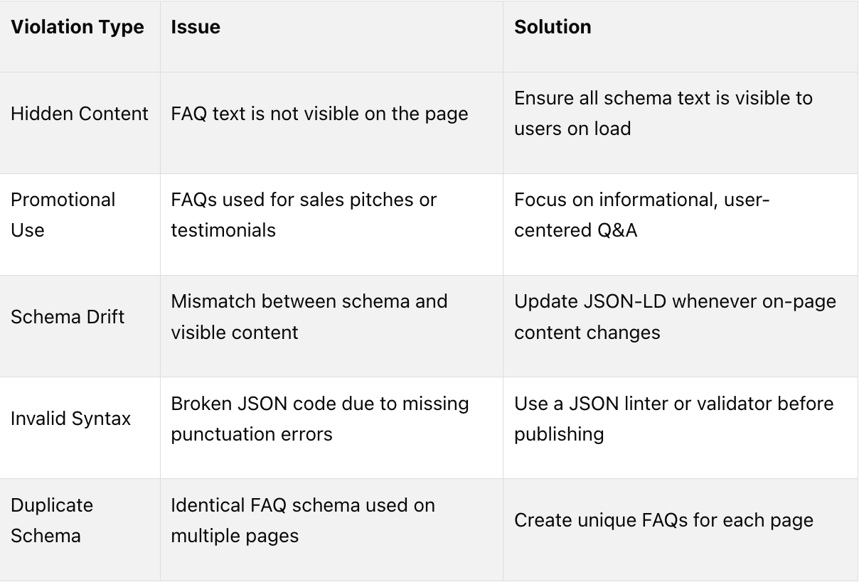 It's also vital to ensure that your JSON-LD markup matches the visible text on your page. Consistency between the name property in your schema and the H2 or H3 headings users see is critical for compliance [6]. As Shegun Otulana, Founder & CEO of Frase, explains: