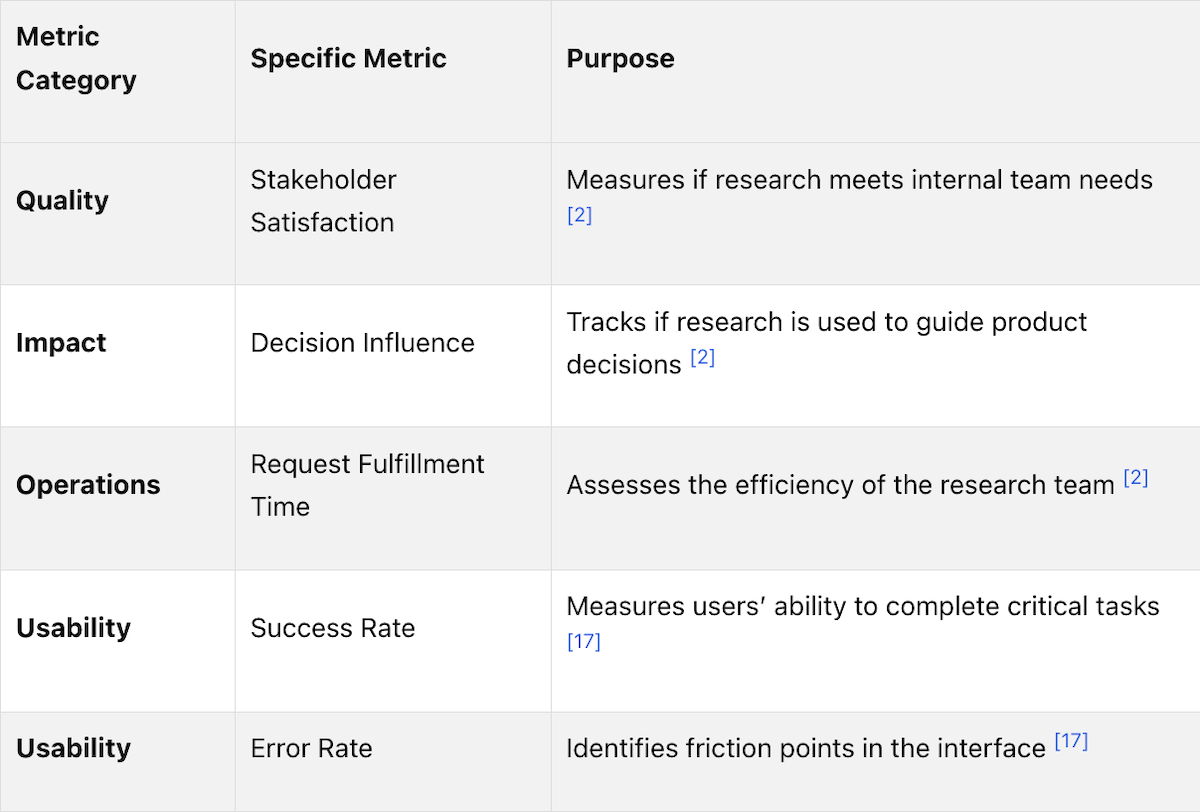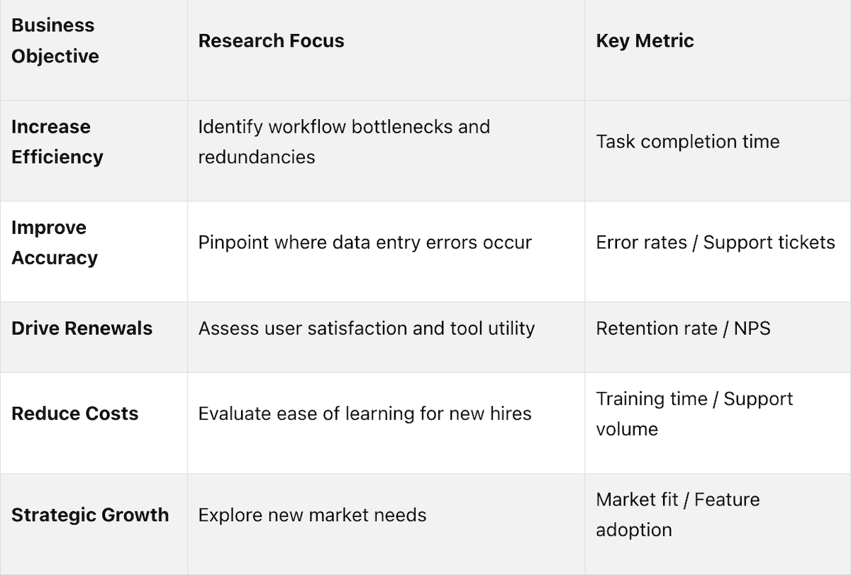 Research objectives should be linked directly to the metrics the business already tracks rather than to research-specific outputs alone. Efficiency goals map to task completion time. Accuracy goals map to error rates and support ticket volumes. Retention goals map to NPS scores and renewal rates. Cost reduction goals map to training time and support volume. This alignment ensures that research findings connect to decisions leadership is already equipped to make, rather than producing insights that exist in isolation from business priorities.
