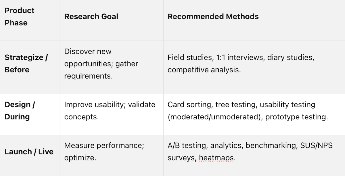 Before design begins, generative methods including field studies, one-on-one interviews, and diary studies uncover opportunities and gather requirements. During the design phase, formative methods including card sorting, tree testing, and moderated usability testing refine workflows and validate concepts. After launch, summative methods including A/B testing, analytics, benchmarking, and NPS surveys measure performance and inform optimization. Experienced researchers recommend conducting at least three different studies per product release, combining qualitative methods to understand why users behave a certain way with quantitative methods to measure how many are affected.