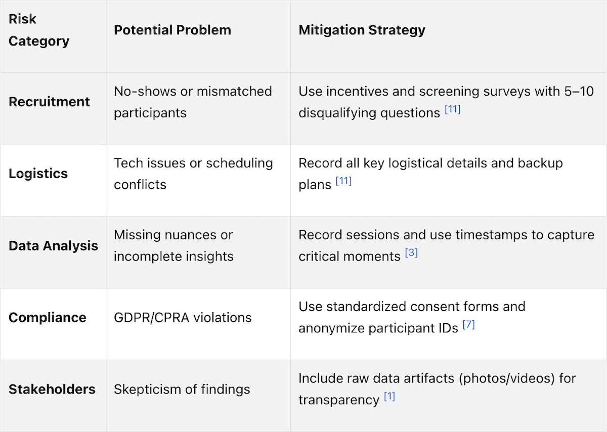 Only 3% to 20% of eligible participants typically agree to join a research study, and 34% of studies fail to recruit even 75% of their planned sample size. Enterprise research compounds this challenge because the person purchasing software is frequently not the person using it daily, meaning recruitment criteria must be built around behavioral attributes, job responsibilities, and usage patterns rather than titles or demographics. Over-recruiting by 20 to 30% for qualitative studies and 10% for quantitative studies, combined with screening questions that verify task-level experience, are the primary risk mitigation strategies.