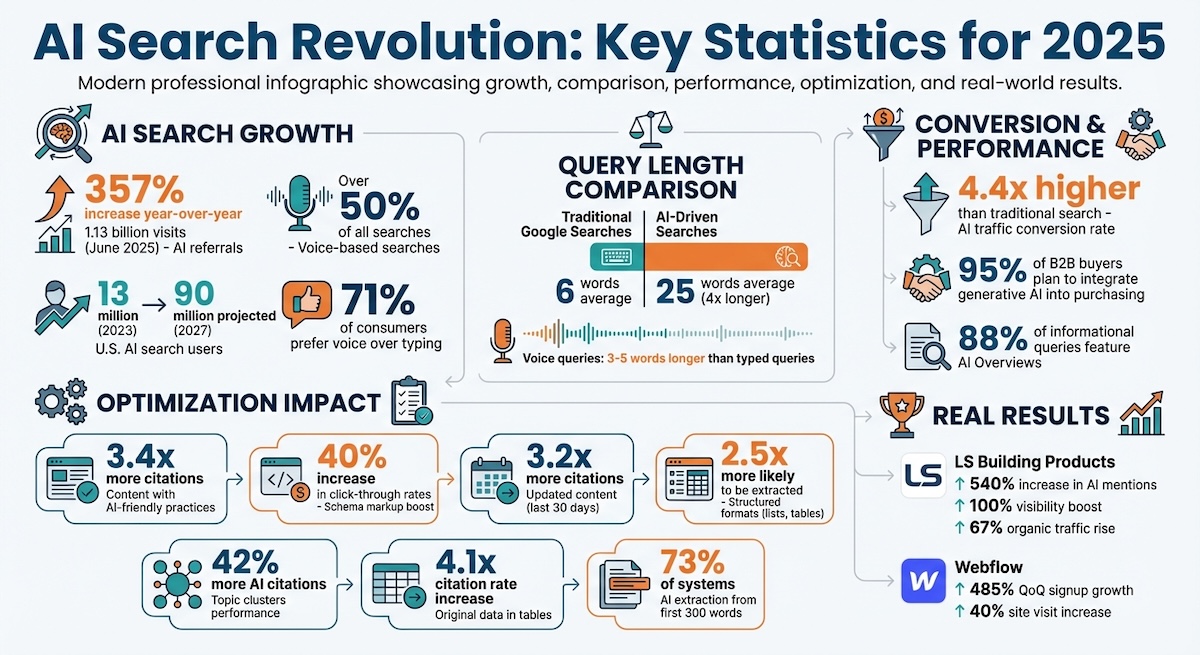 AI-driven search uses much longer, conversational queries - averaging 25 words compared to 6 in traditional search. Over half of all searches are now voice-based, and AI tools deliver direct answers instead of just lists of links, making it crucial for businesses to be the trusted source AI systems reference.
