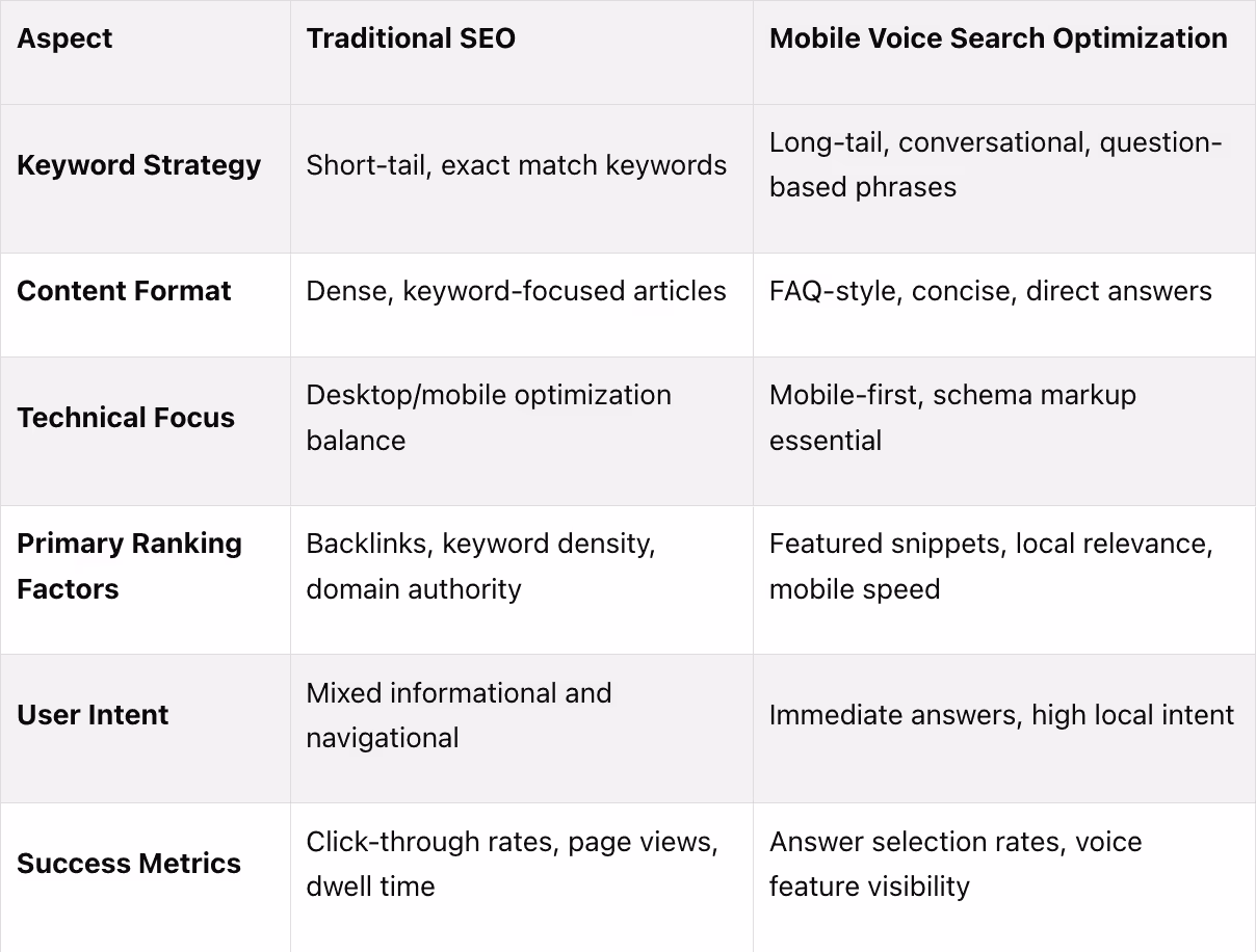 The rise of voice search has completely reshaped SEO strategies. Traditional methods no longer cut it in this voice-first world. Here’s how the two approaches differ: